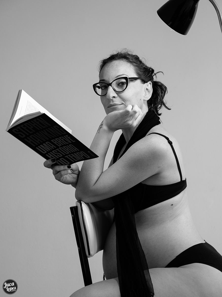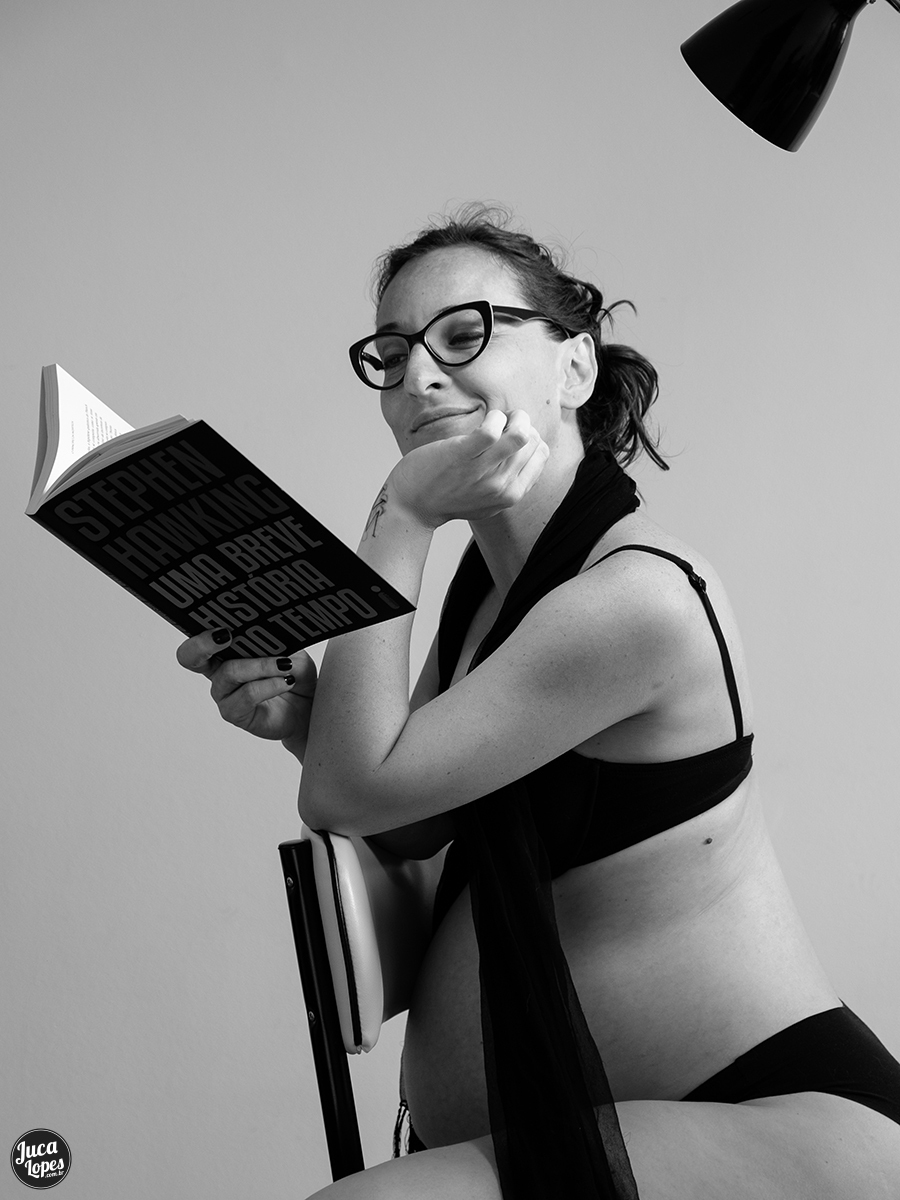 Uma Breve História do Tempo é um ensaio de gestante Pin-up com uma pitada de noir que foge ao cliché. Queríamos fugir daquelas imagens estereotipadas de gestantes de tutu em um balanço kitsch coberto de flores velhas de plástico e da ideia de que quando a mulher se torna mãe tem de abdicar de sua sexualidade (bela, recatada e do lar? eca!). Queríamos mostrar que as mulheres são livres para ser quem elas quiserem e contar um pouco sobre esse momento em que, por mais longo que pareça, passa muito rápido.